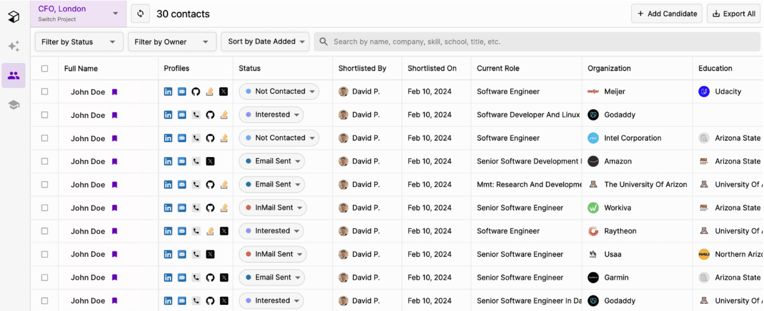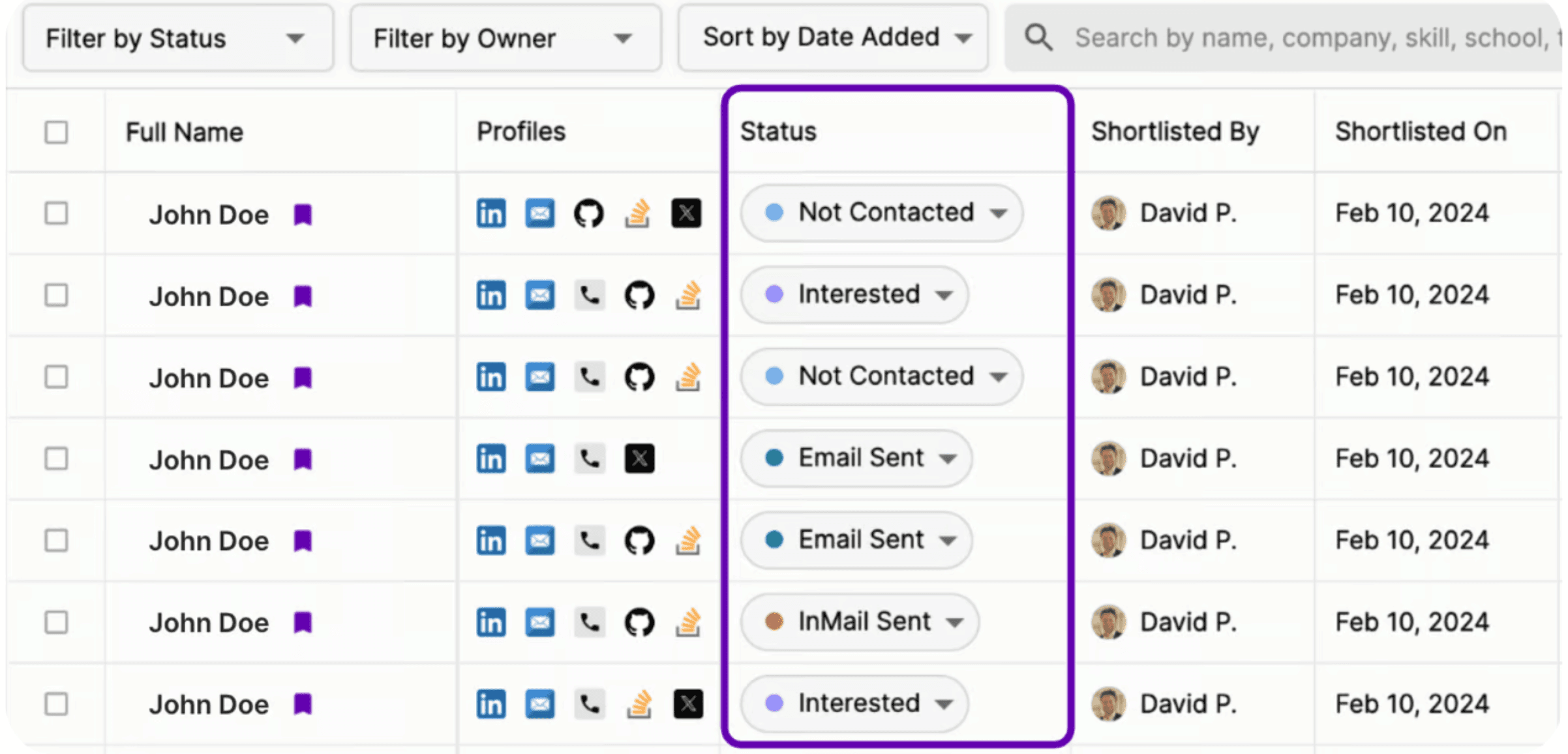 Use filters, such as filtering by status or owner, to narrow down your shortlist. Or sort profiles by date added or outreach status. And in case you need to dive deeper, use the search bar to search through all shortlisted profile data, including their name, skills, jobs, and more. Details here.