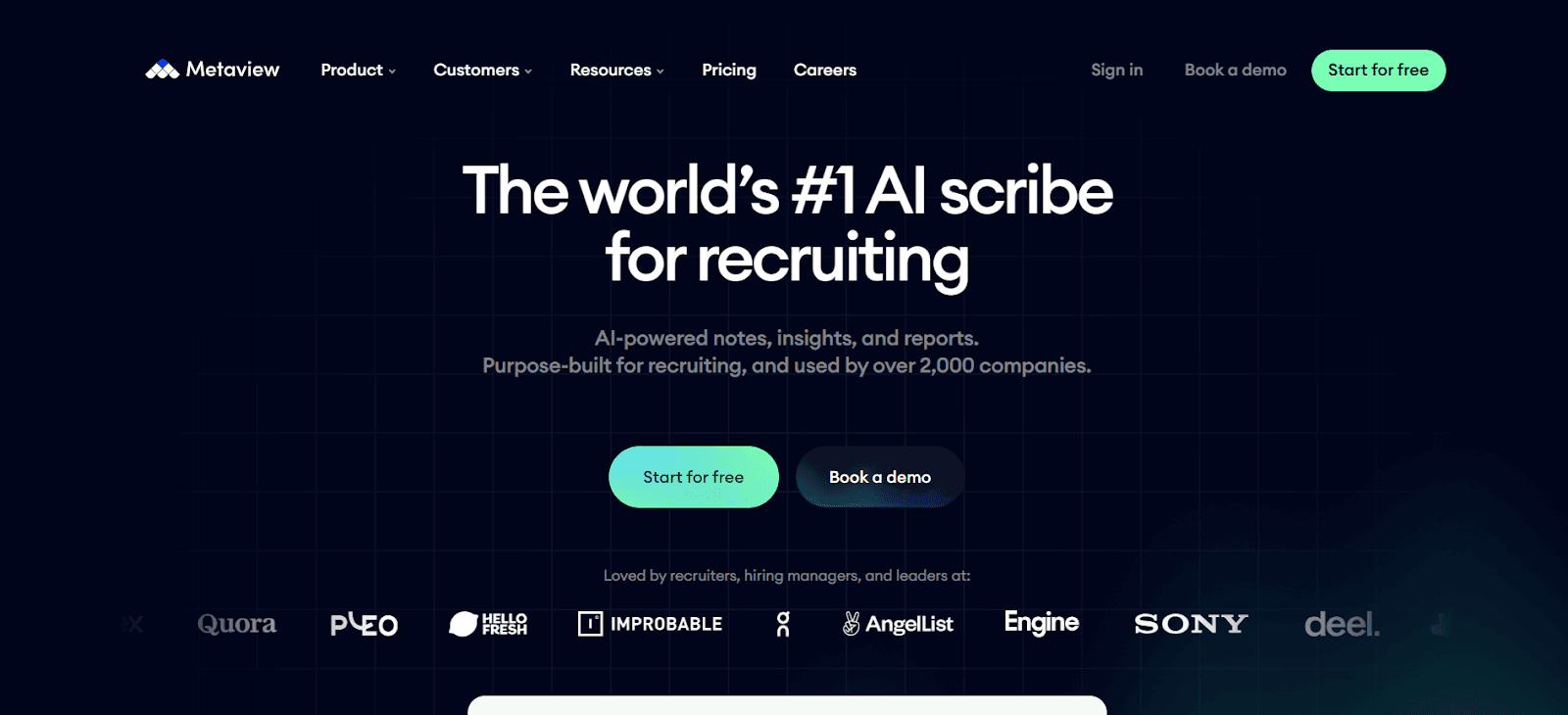 AI-powered tool automating interview note-taking and transcription, with customizable templates and comparative candidate analysis. Integrates with ATS like Recruiterflow, is GDPR-compliant, and trusted by 2,000+ companies for enhancing focus during interviews.