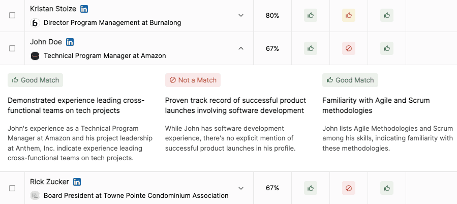 Click on any candidate profile to receive a detailed summary of how well they meet your requirements. For example, while John's profile indicates experience in leading cross functional teams and familiarity with Agile methods, he didn't mention software development in his profile.