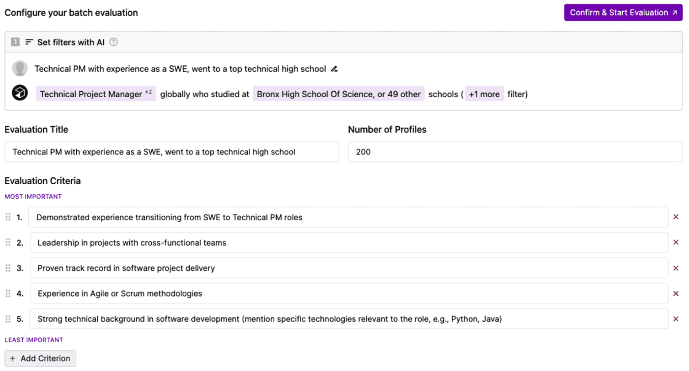 - Run batch evaluations to assess up to 750 profiles against all criteria.