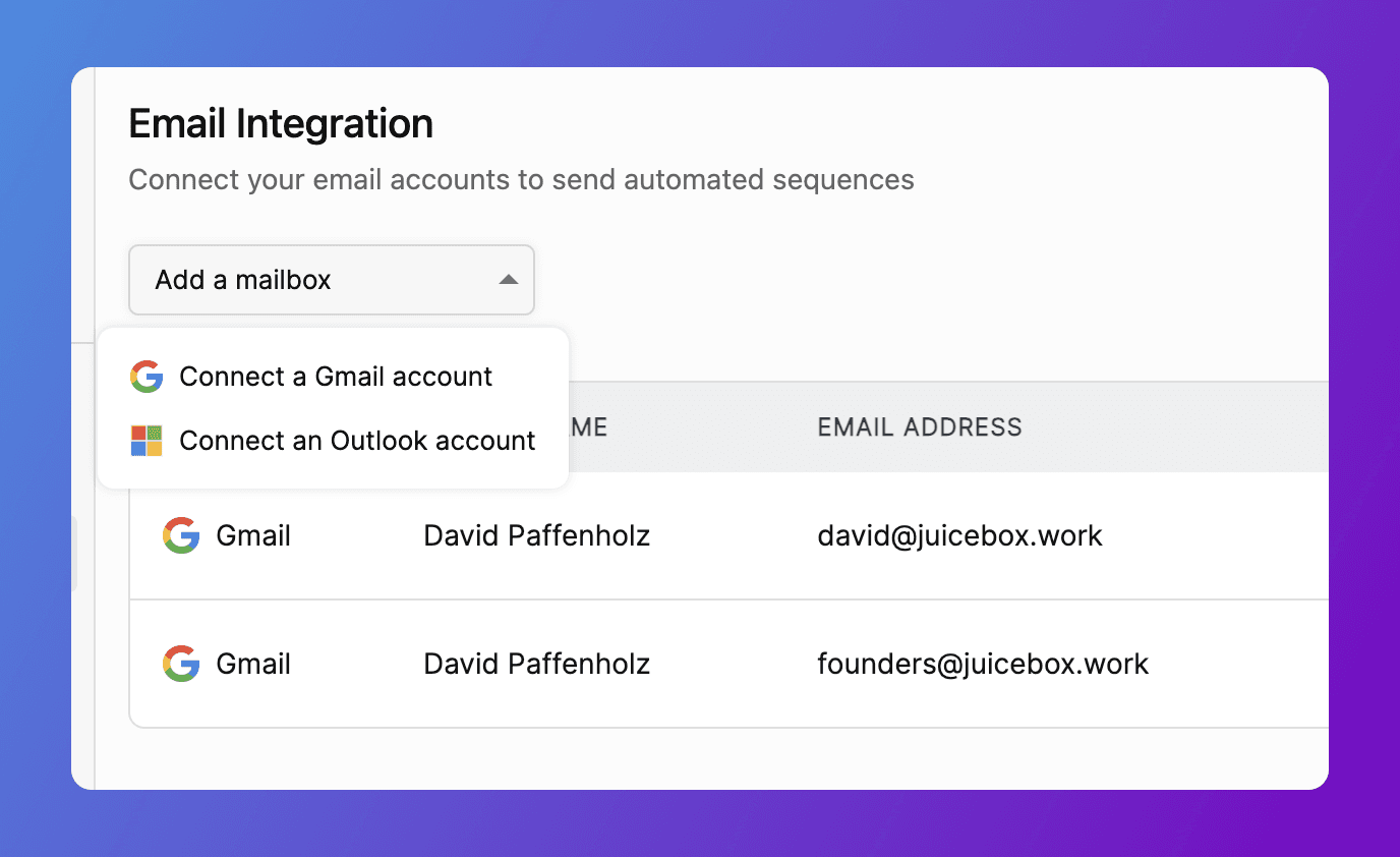 Connect and switch between multiple email addresses for your outreach. Start with one mailbox on Standard, two on Growth, and four on Business plans. Each mailbox maintains its own sequence settings and analytics, allowing you to maximize your outreach capacity while retaining deliverability.