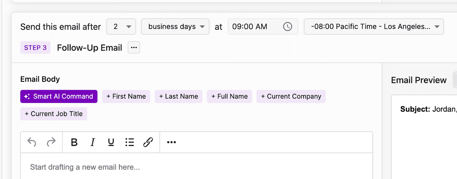 You can select your preferred follow-up timeline and personalize your follow-up messaging with variables and AI. For example, follow up 2 days after the initial email describing the career growth associated with the opportunity you’re offering.