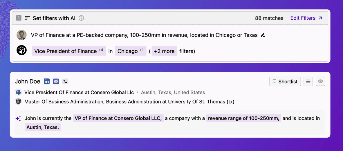 Looking for a VP of Finance who has experience at PE-backed businesses with $100-250M in revenue? Set up nested searches in just one prompt — and add in industry or company size data to narrow the search even further.