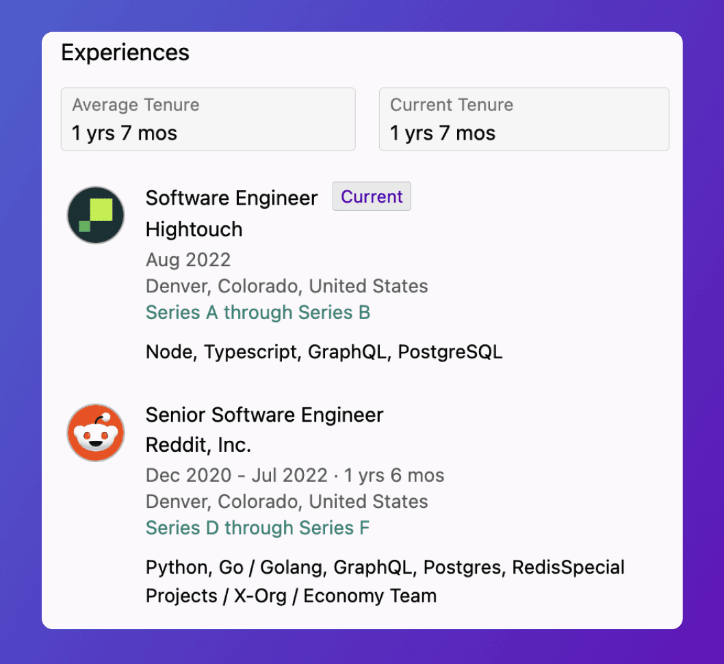Want to see all engineers who were at Facebook at Series A stage? Or engineers at Uber at Series B? Configure historic searches that combine the specific time an individual worked at a company with the company’s applicable funding stage.
