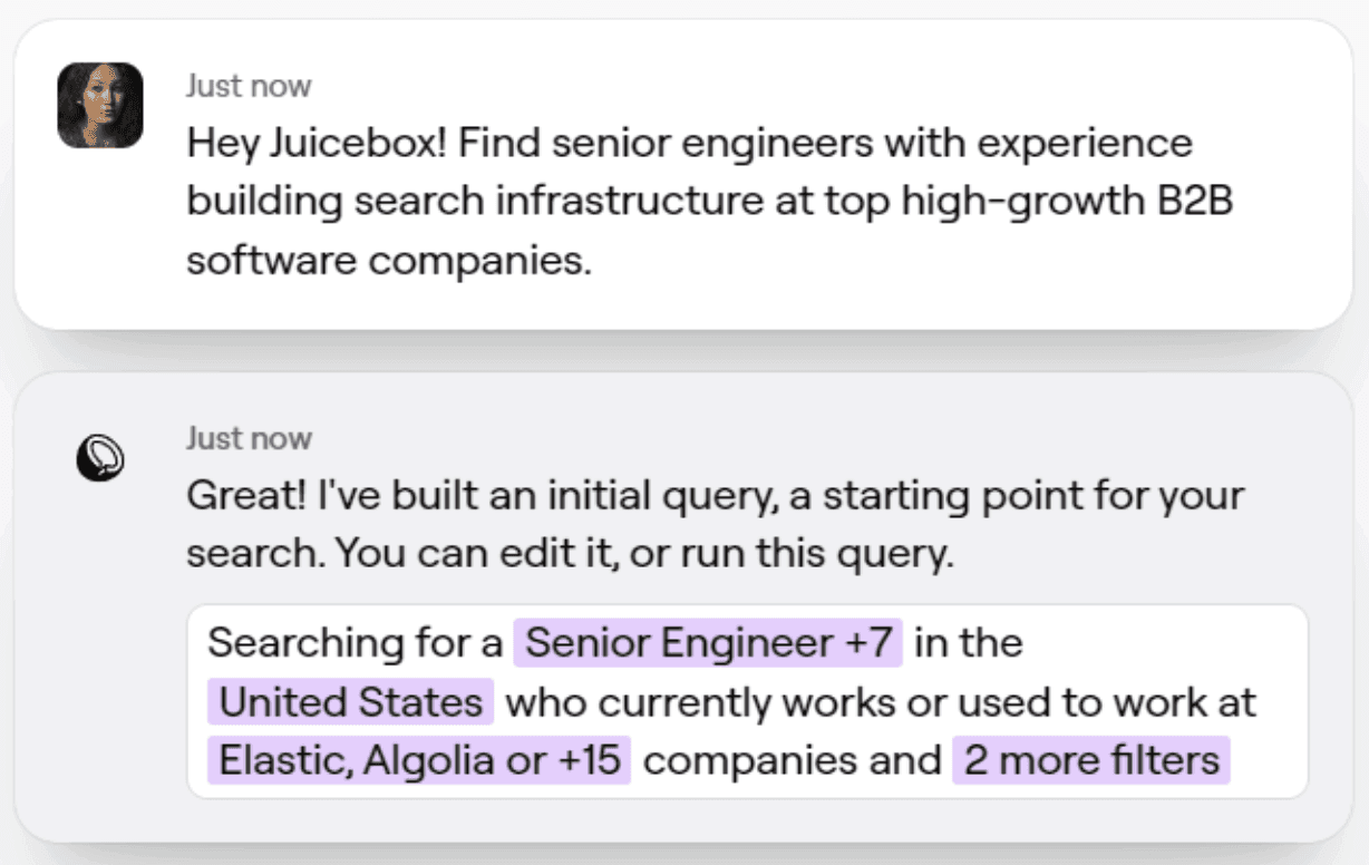 An AI-based tool like Juicebox significantly speeds up the process by returning a list of potential matches in seconds. Recruiters "speak" to PeopleGPT (the AI engine powering the platform) using natural language to describe the person they're looking for. For example, “Find senior engineers with experience building search infrastructure at top high-growth B2B software companies.”