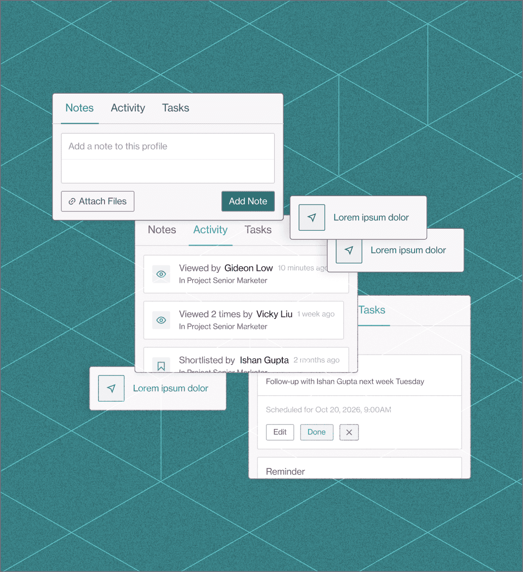 Every interaction is logged automatically across all your profiles. This includes notes, activity, tasks and more across any candidate profle in Juicebox.
