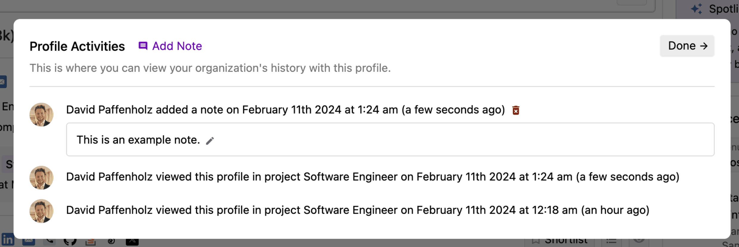 Add notes to each candidate, shared across your team. You can access the notes via the profile activities tab in each profile, edit, and delete them.