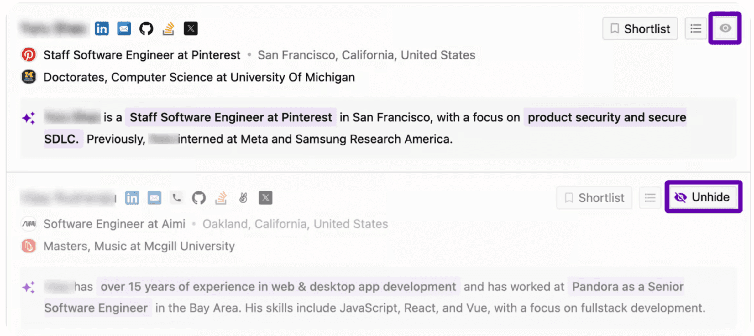 Want to hide a profile from future search results? Use the new hide profile feature. Hiding profiles ensures they won’t be shown on any search within the same project, while still allowing you to unhide profiles if necessary. More here.