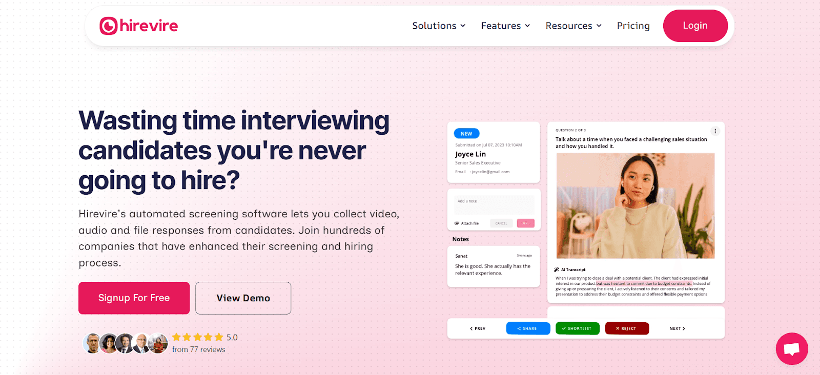 AI video interview tool with automated transcription in 90+ languages. Focuses on candidate evaluation with scoring and insights, integrating with ATS for efficient screening in global hiring scenarios.