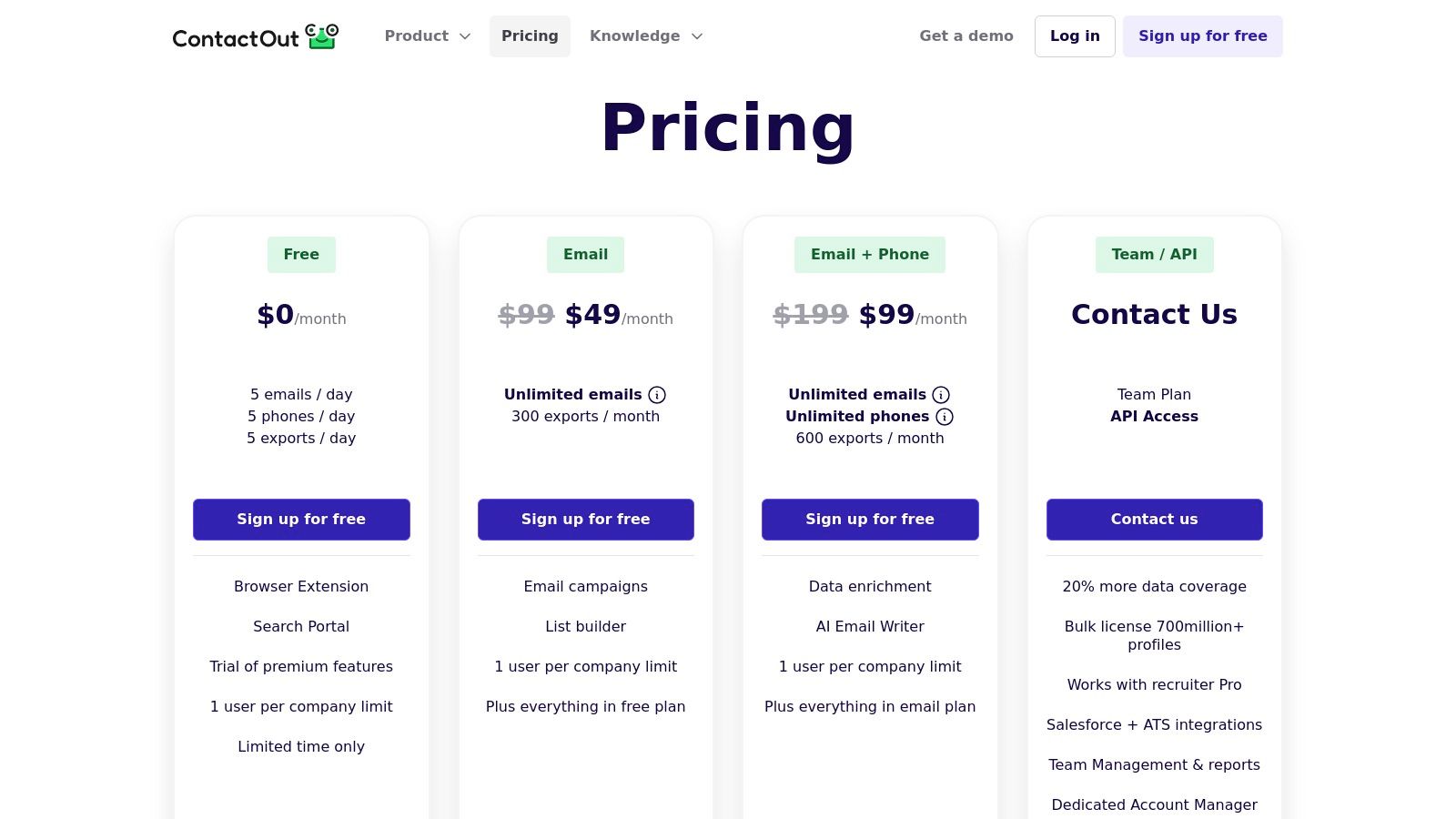 - Pricing: ContactOut offers several tiers, including a limited free plan. Paid plans are billed annually per user, with pricing structured around contact credits.