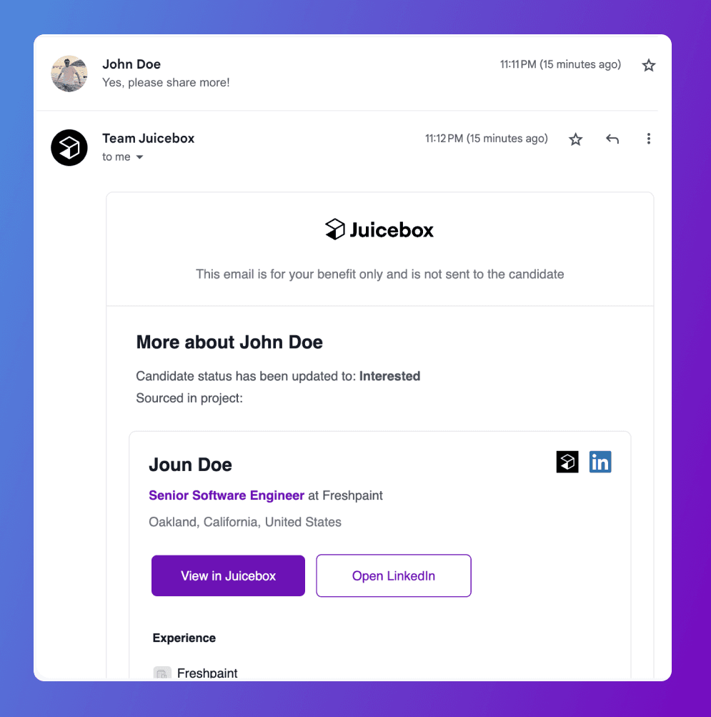 Never lose context in your recruiting conversations again. When candidates respond to your sequences, Juicebox automatically sends you an email with details on the candidate – including work experience, education, and AI-determined interest status. Alongside their Juicebox and Linkedin URLs.