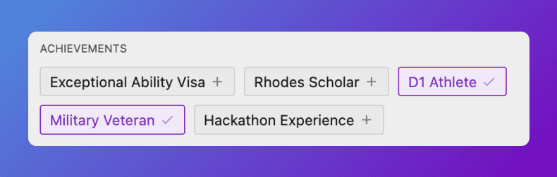 New power filters help you identify D1 Athletes, Military Veterans, and candidates with Hackathon experience. Add any power filter to your search, or add multiple at once!