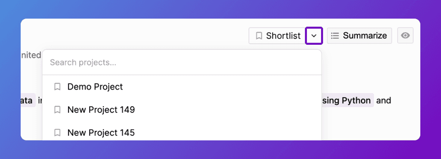 We've made it easier to manage candidates across projects. Shortlist candidates directly to any project from the search page, and easily move entire searches between projects. Perfect for teams managing multiple roles or reorganizing their hiring pipeline.