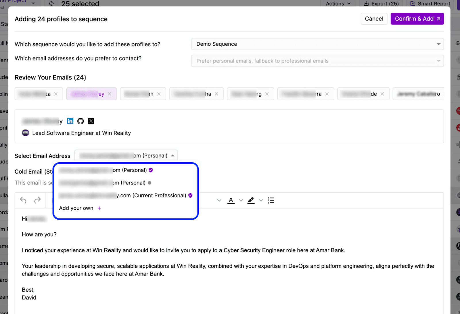 Found 30 potential candidates who could be a great fit? Add them to your sequence in bulk. Within a few seconds, Juicebox will:
