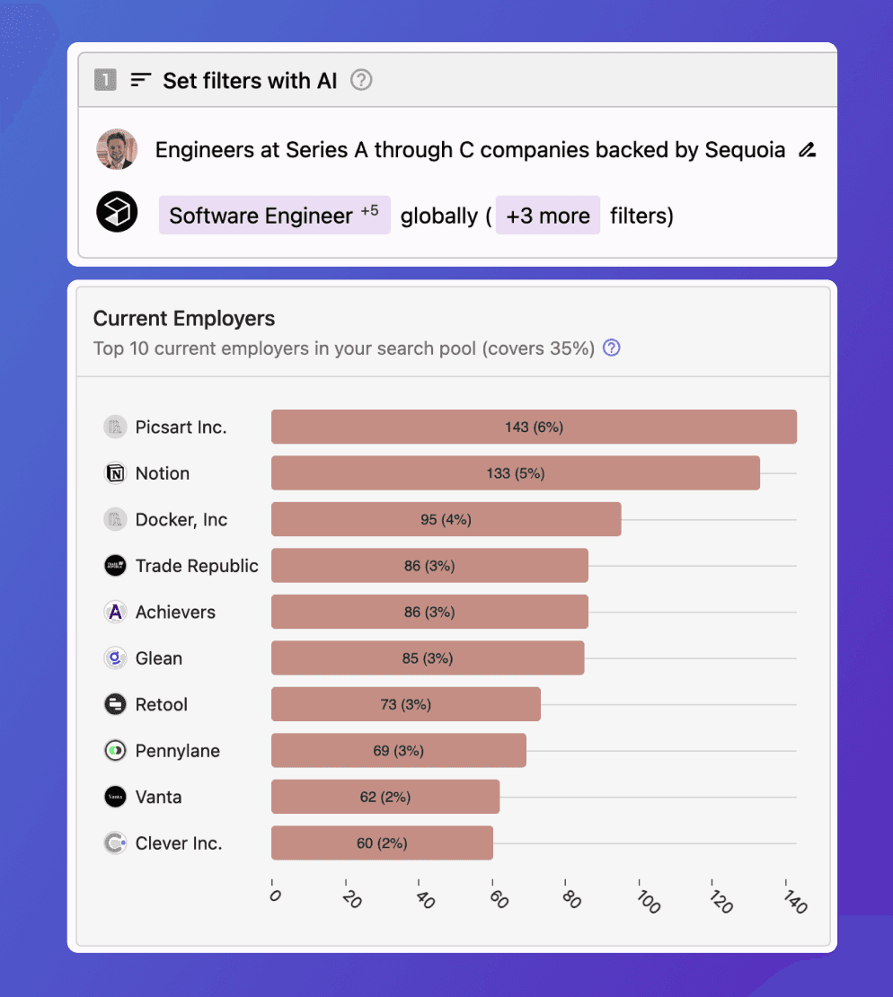Prompt PeopleGPT: show me talent that previously worked at Sequoia-backed Series B companies. What companies are they working at now? Use our Insights tab in combination with funding filters for detailed talent tracking.